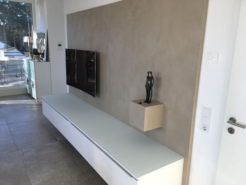 Hängendes Sideboard mit zwei großen Schubladen und oben aufliegender Glasscheibe. An der Wandscheibe befindet sich die Halterung für den TV und ein Kubus zur Präsentation einer Skulptur.