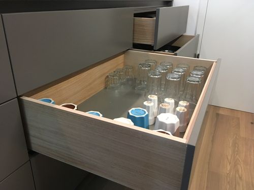 Die Edelstahl - Schiebeleiter ermöglicht den Zugriff auf Schränke und offene Elemente im oberen Bereich. Wird sie nicht benötigt, kann sie neben den Hochschränken "geparkt" werden.