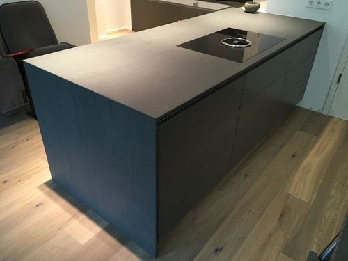 Die Kochinsel kann von der Küchen- und der Wohnraumseite aus bedient werden. Auf der Küchenseite mit vielen großzügigen Schubladen und auf der Wohnraumseite mit Türen. In der Insel befindet sich das Induktionskochfeld mit integriertem Abzug. So wird der Blick vom Wohnbereich zur Küche nicht durch einen hängenden Dunstabzug gestört.